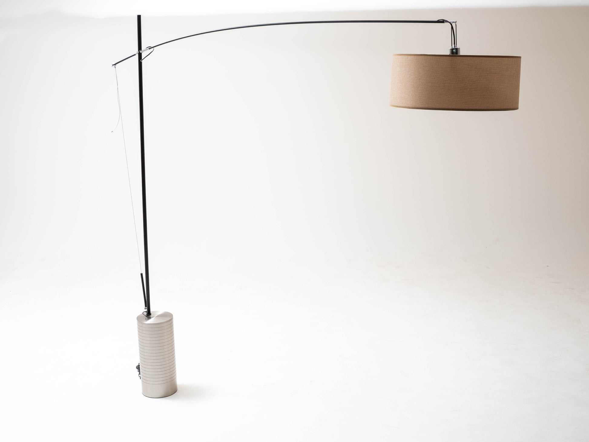 This elegant floor lamp showcases a striking arc design with a refined, modern aesthetic. Featuring a tall, slender black metal stem anchored by a sturdy cylindrical base, the lamp extends into a gracefully curved arm that suspends a wide, drum-shaped fabric shade. The neutral-toned shade softly diffuses light, casting a warm and ambient glow ideal for cozy interiors. Its minimalist structure is enhanced by subtle industrial detailing, creating a perfect balance between function and style. Ideal for living rooms, reading corners, or contemporary office spaces, this sophisticated lighting piece adds a touch of understated elegance while making a bold visual statement