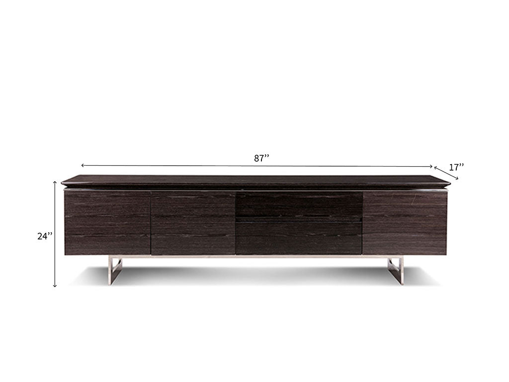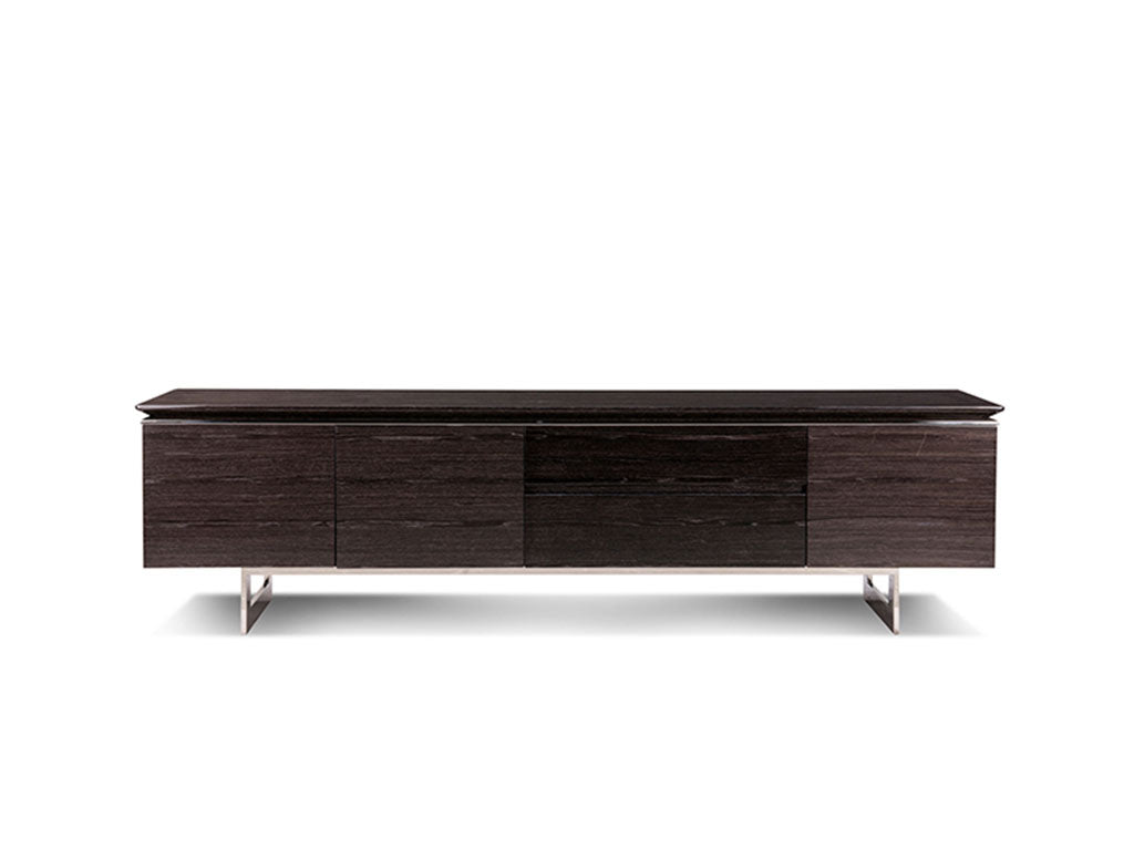 With competent construction using veneer wood and chrome finished stainless steel legs, this TV Unit is enduring & resilient piece. Complemented with a practical design, this simple unit with stylish form has gloss finish for unique look. Sleek metal lining flows through the boundaries to justify its popularity.