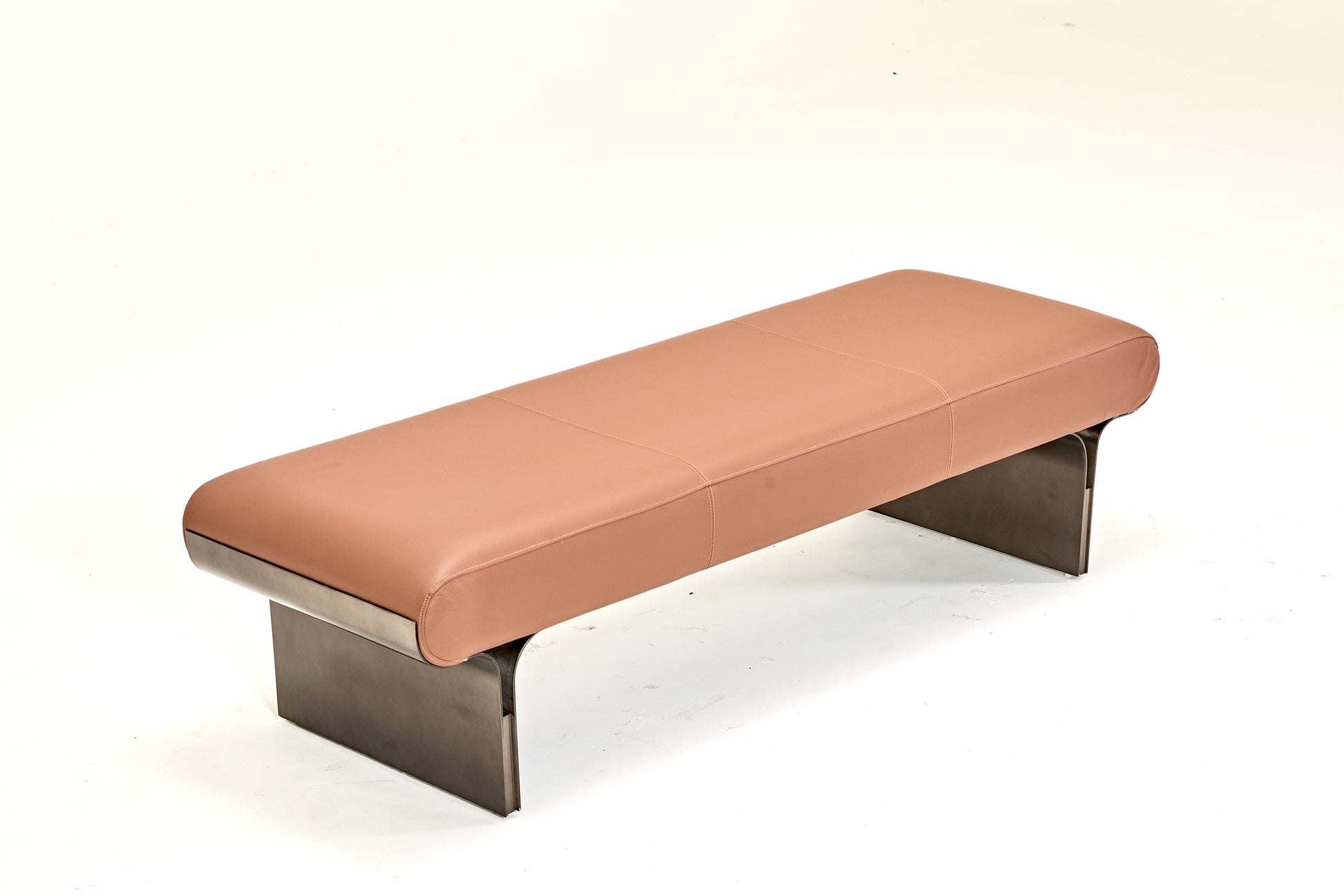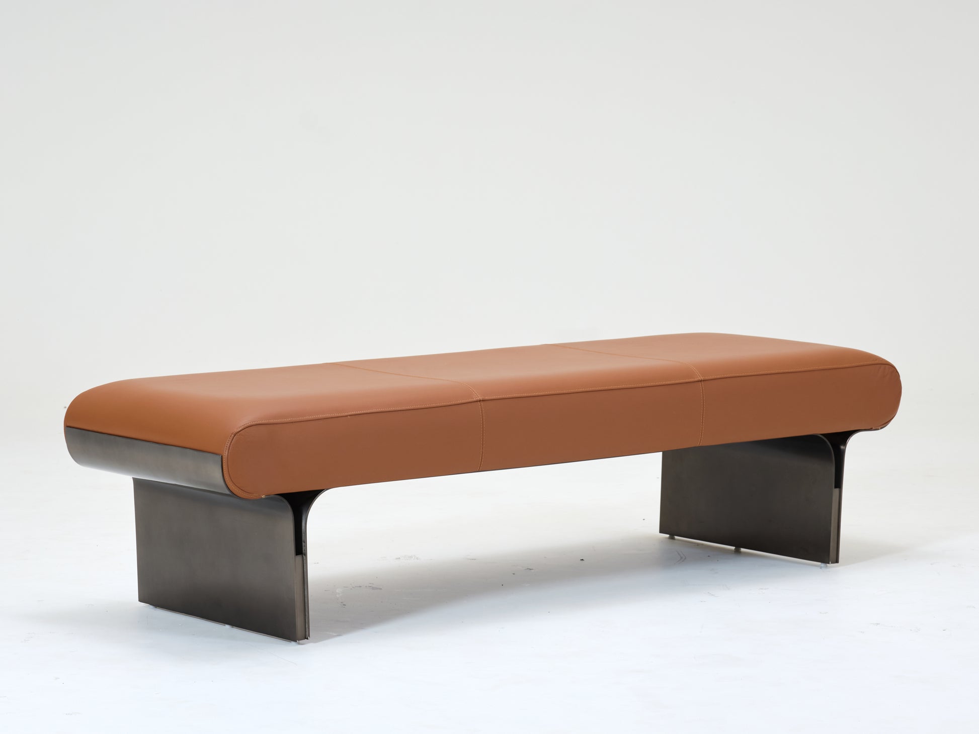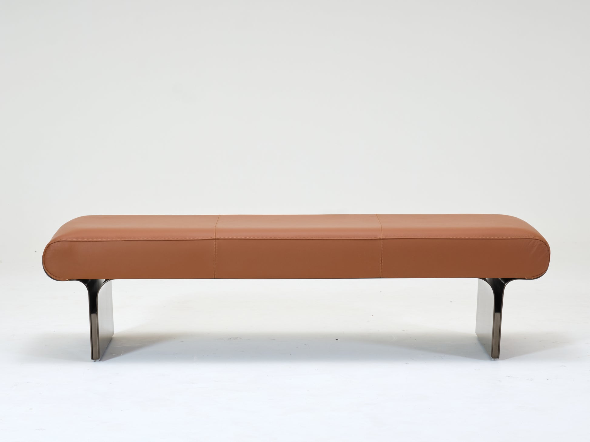 A sophisticated piece of furniture featuring a smooth, tan leather seat. The bench has a streamlined and modern design, supported by sturdy, dark metallic legs. Its minimalist form makes it a versatile addition to contemporary interiors, blending comfort with style.