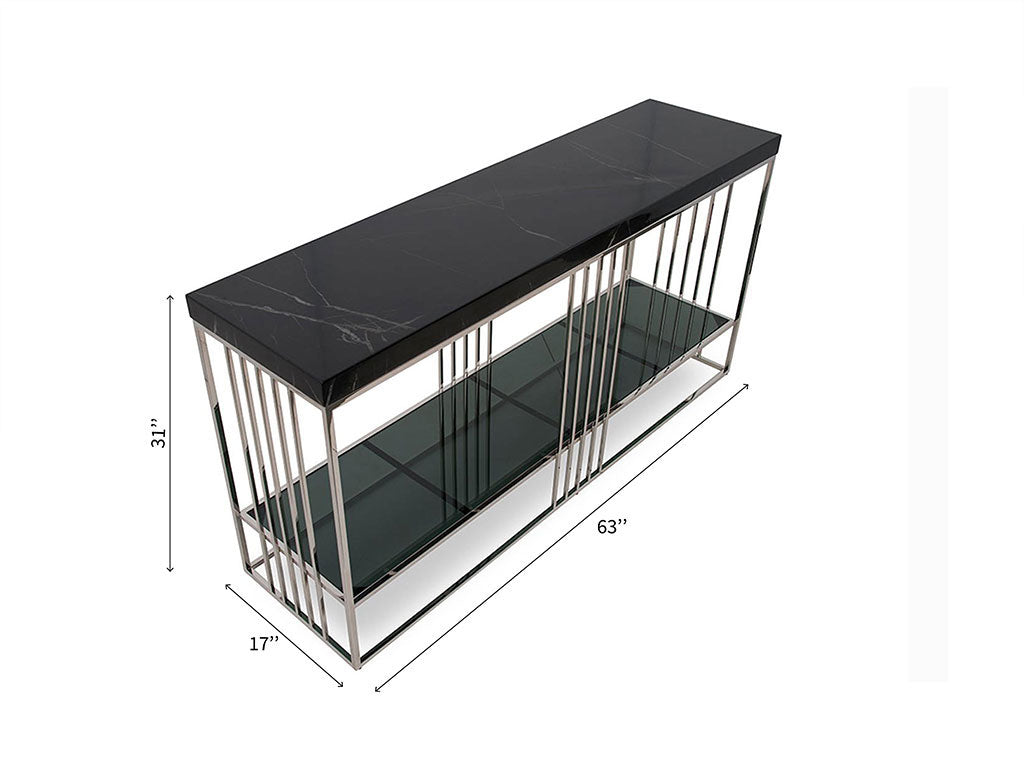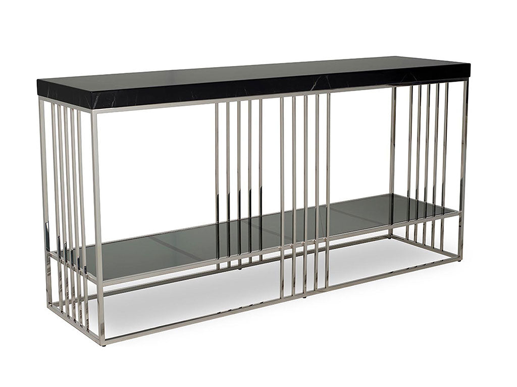 Introducing the exquisite Yuri console, a symbol of sophistication that seamlessly blends into any ambiance. This versatile piece is available in black marquina marble, exuding timeless beauty. Supported by a sleek stainless steel base, the Yuri console combines strength with aesthetic appeal. Whether placed in a modern living room, an upscale entryway, or a chic hallway, this console adds a touch of luxury to any space. Elevate your decor with the graceful charm of Yuri and make a bold statement in style and refinement.