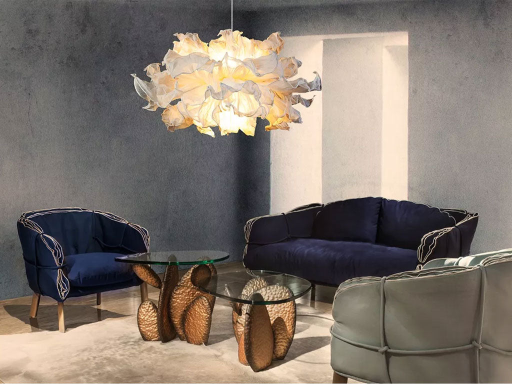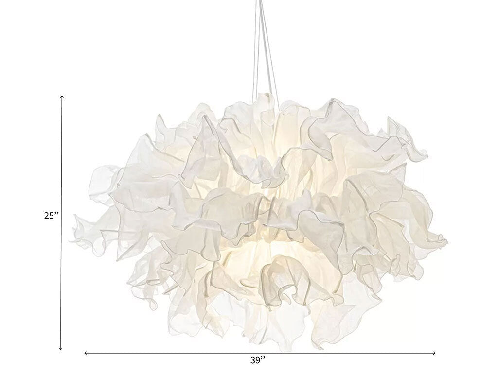 Meet the Fandango Chandelier – a captivating dance of drama and luxury. This lighting fixture embodies theatrical expression, gracefully swaying like a twirling dress. Crafted with layers of muslin cotton cloth petals, each adjustable to create the perfect wave. The piped-edge design offers a blend of structure and fluidity, adding a touch of opulence. Illuminate your space with the Fandango Chandelier, where artistry and elegance combine in an enchanting performance of light and design.