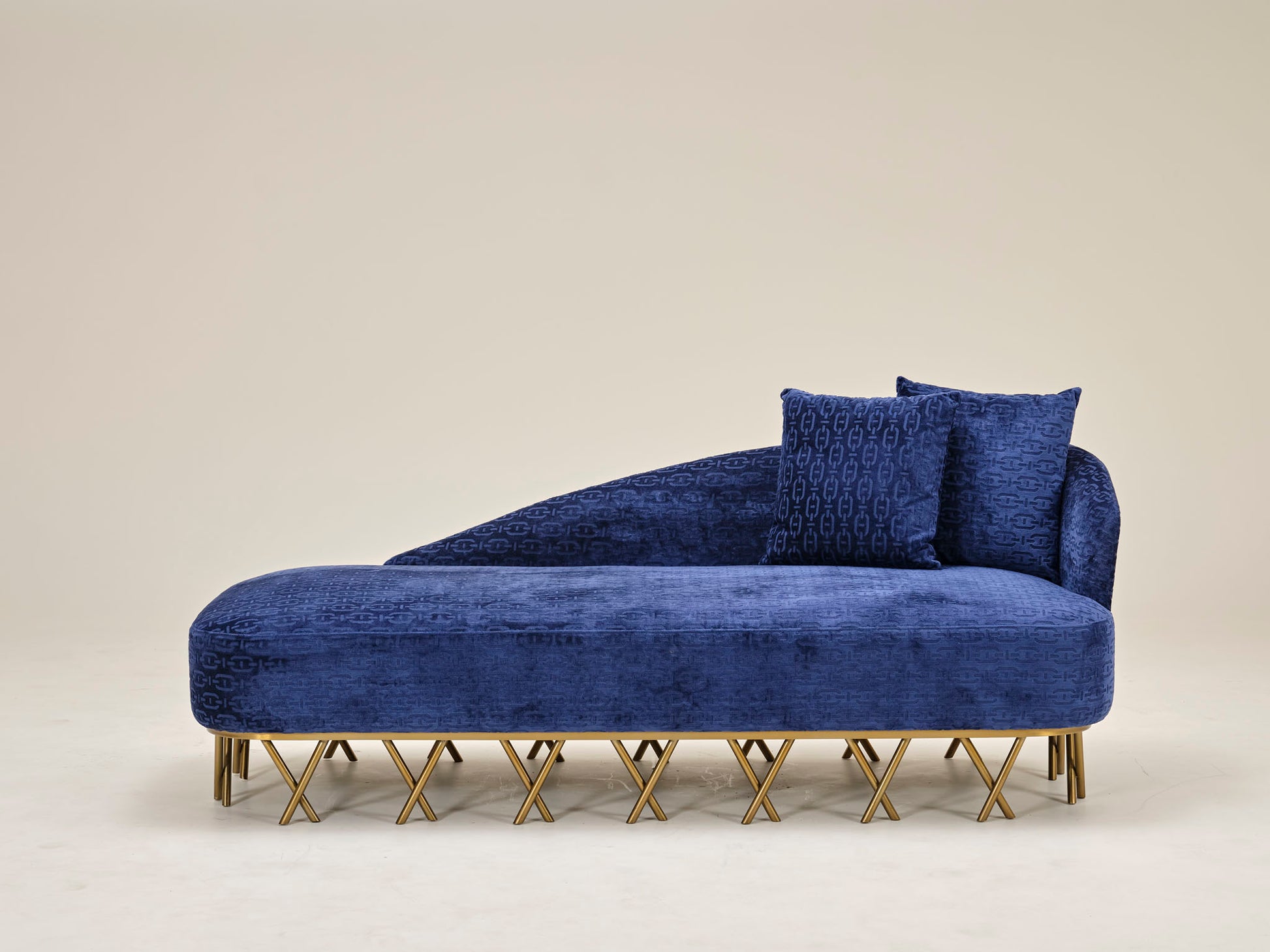 Defined by a bold contemporary vibe, Cross Lounger features a solid frame, textured fabric upholstery, and resilient cushioning. Its refined construction provides lasting comfort, while the distinctive silhouette and metal cross-base detailing enhance interior aesthetics through a balanced blend of function and elegance.