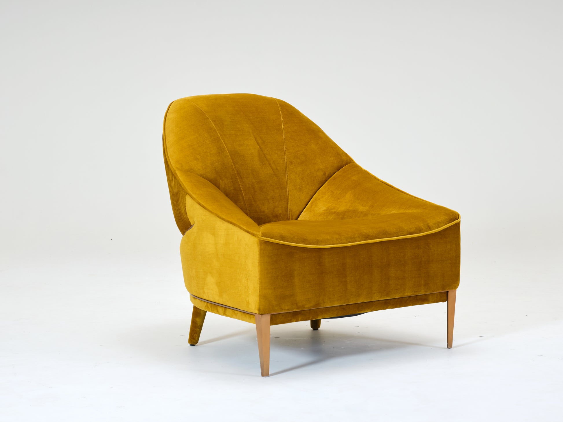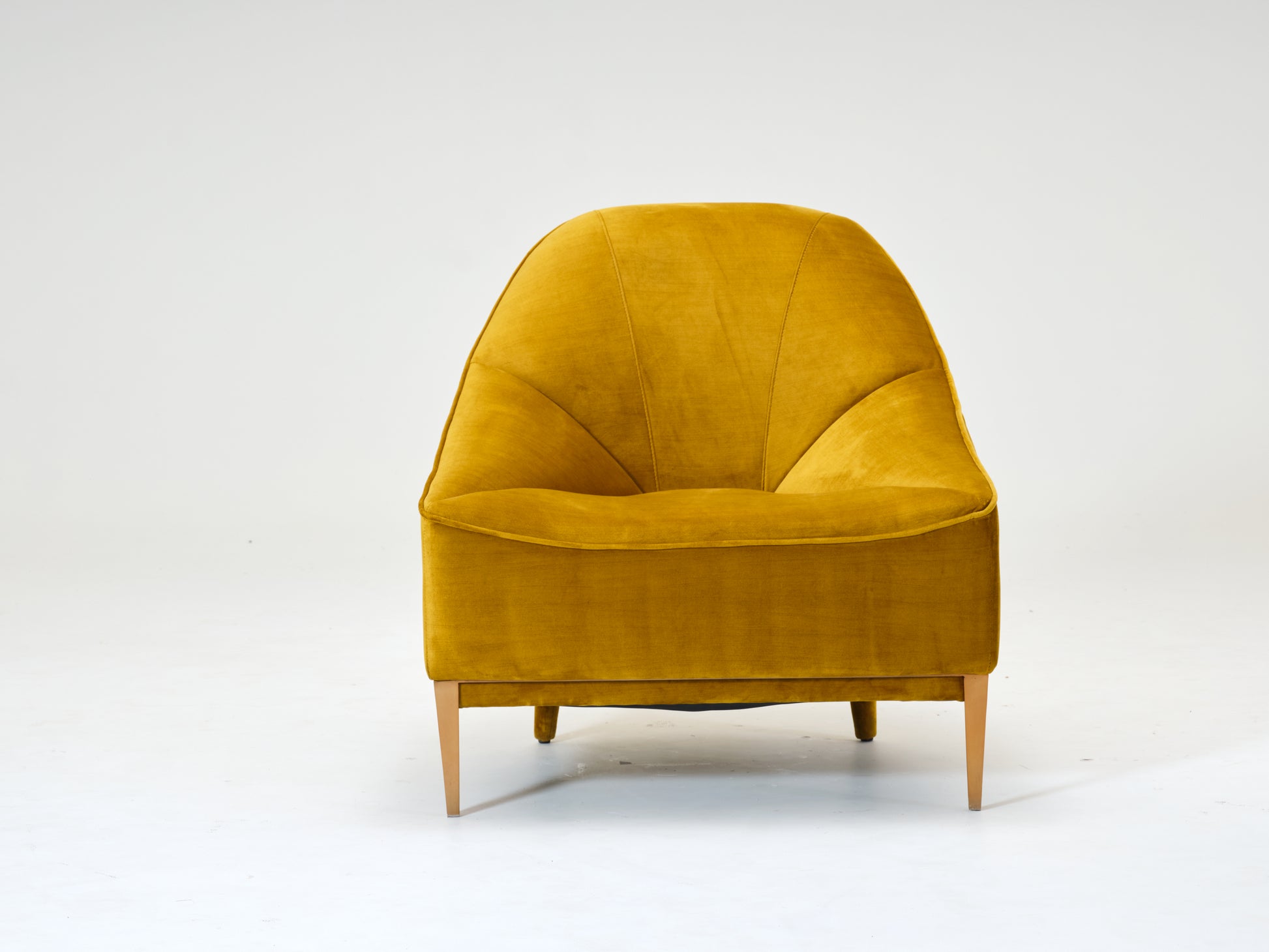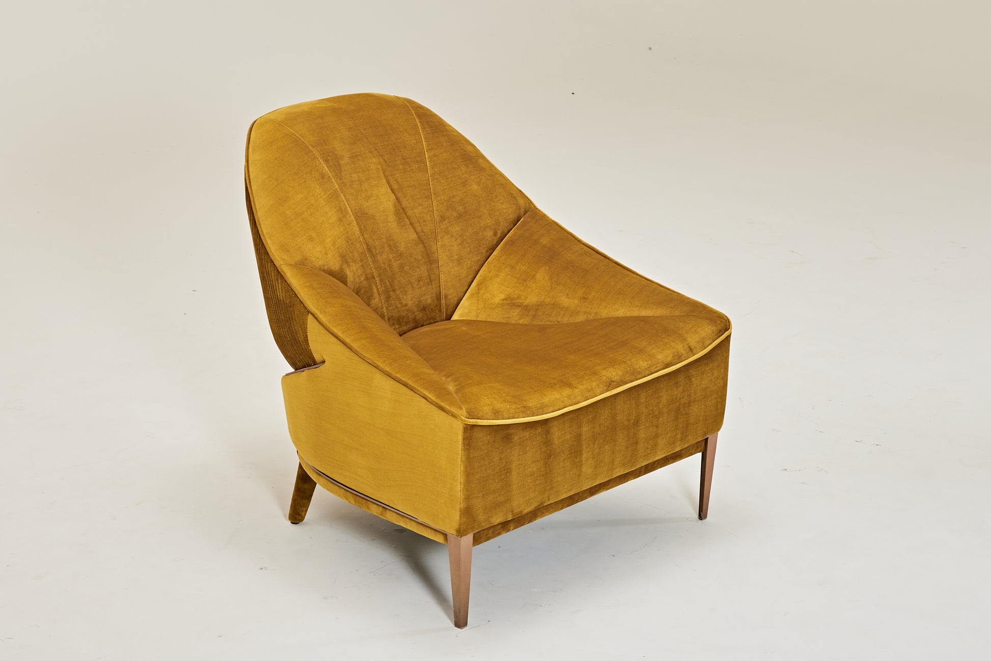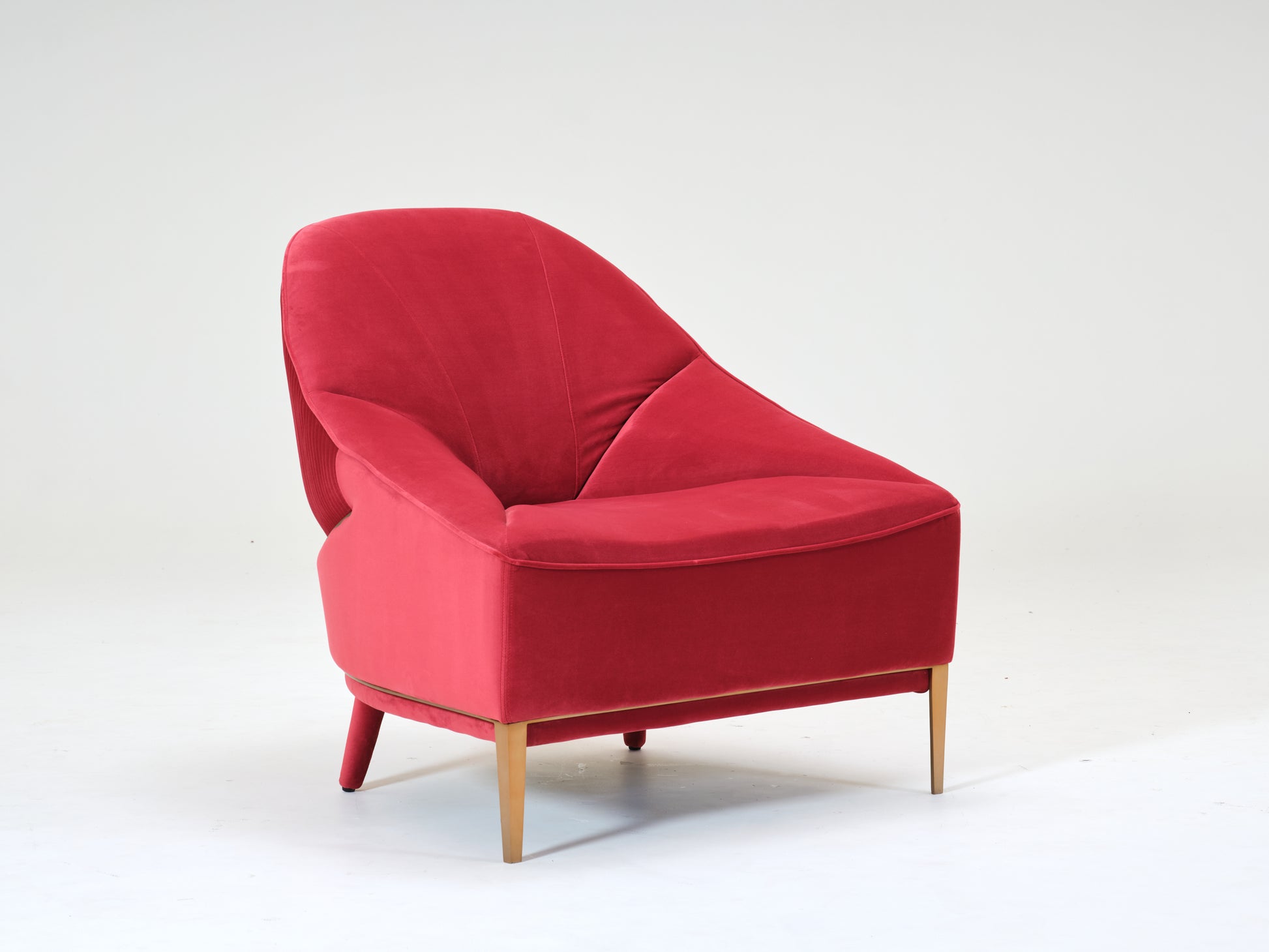 A shows-topper, Exo is meant to bedazzle and glamorize spaces. This leisure chair radiates class, coolness and beauty of incomparable standards. Upholstered in velvet fabric, the chair holds a perfect posture for leisure time. Skillfully designed, the elegant curve with clean lines and metal touch at the back just add a WOW element to its charm! This modern living room leisure chair sits upon four tapered SS metal feet highlighted in gold finish. It’s perfect to place at home in modern and contemporary aesthetics.