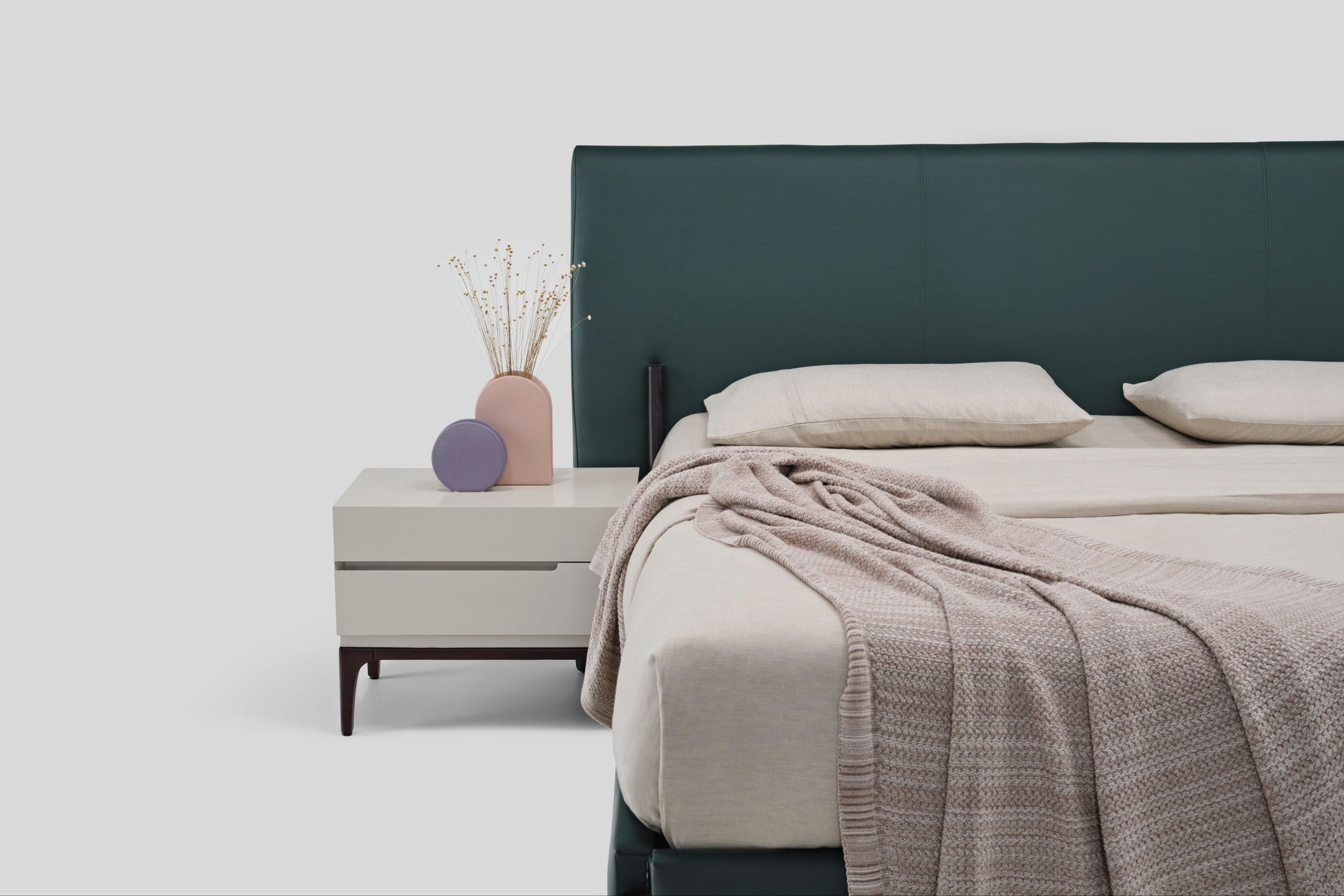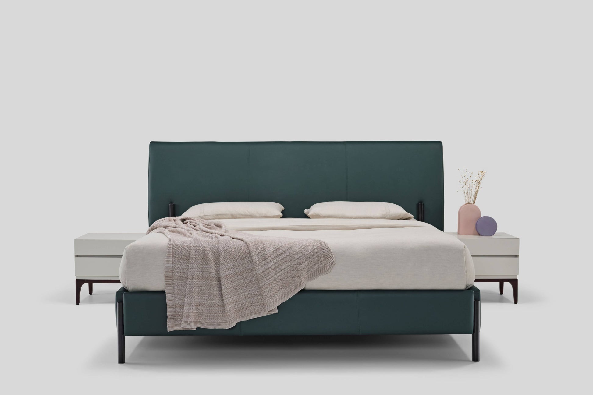 The Galata bed boasts a solid Fir wood frame, metal bed surround, and polyurethane foam padding, ensuring comfort and durability. Choose from fabric or leatherette upholstery, accentuated by contrasting stitchings for an elegant finish.