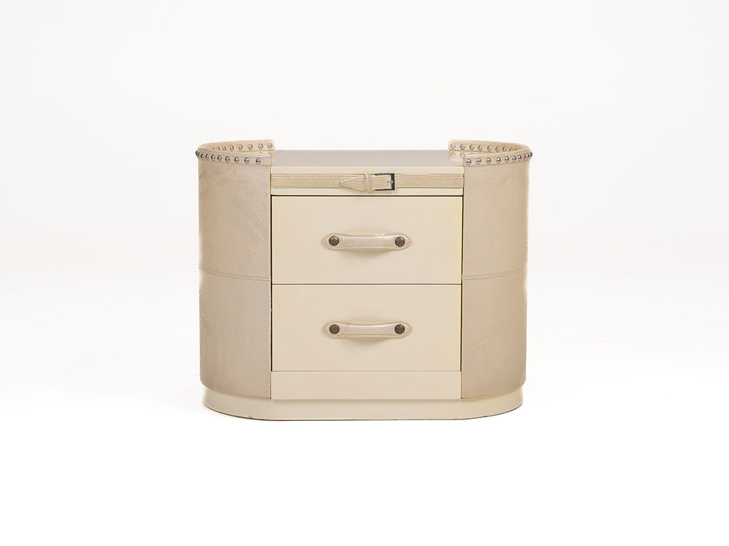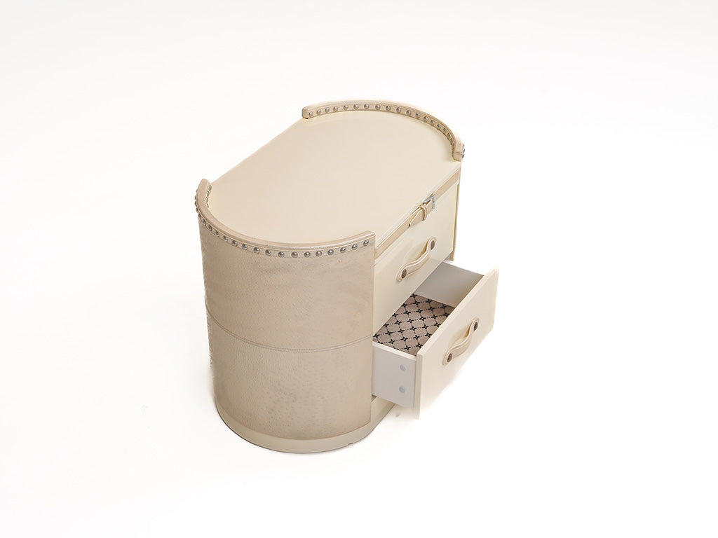 Discover the captivating HlW 388 - a stylish and functional addition to your bedroom. Its unique capsule-like shape and pearl-colored leatherette upholstery create an exquisite centerpiece. Experience a perfect blend of elegance and utility with this stunning bedside table, elevating your space with a touch of luxury.