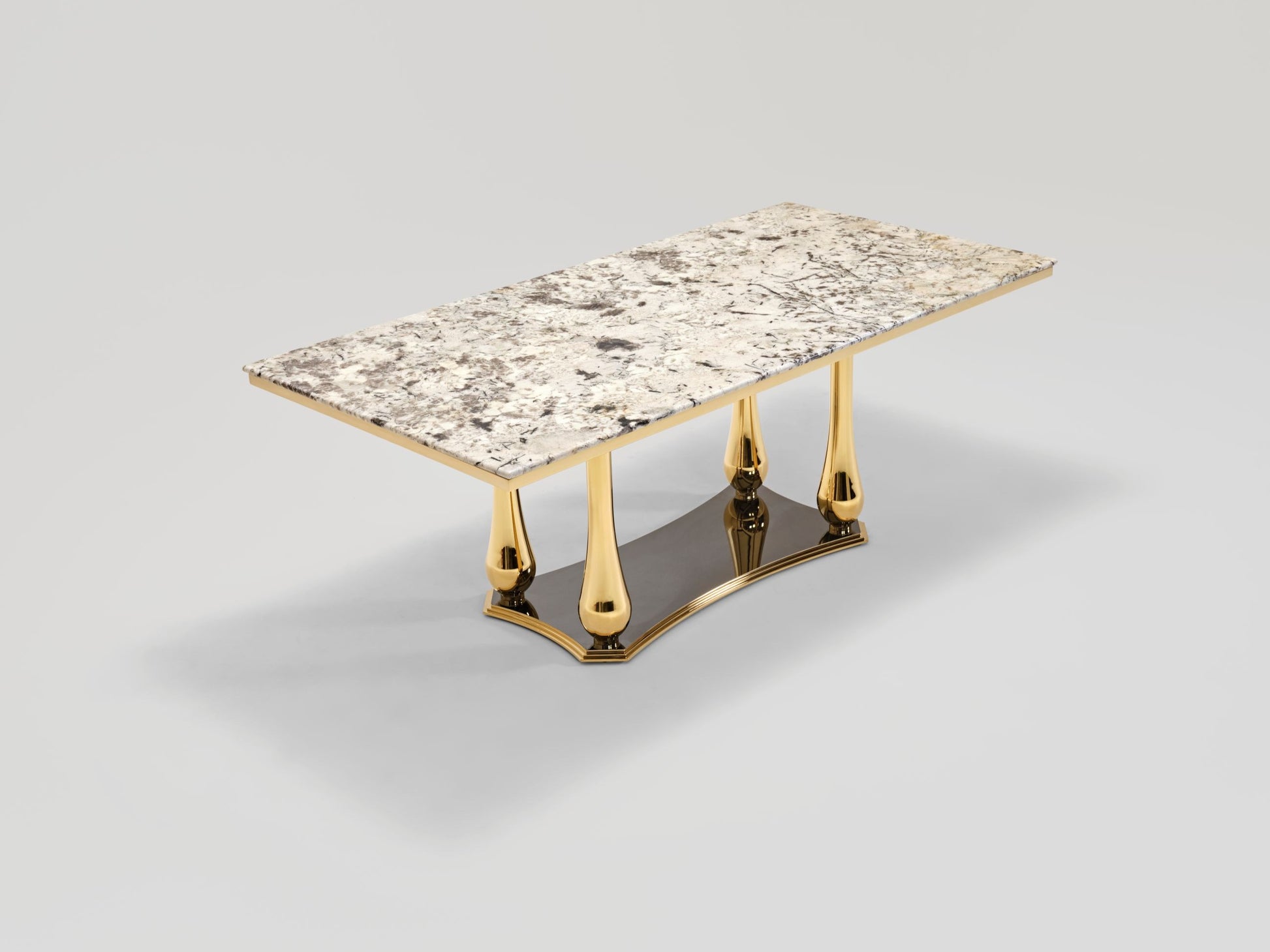 The Lancer Dining Table exudes opulence with its stunning marble top and elegant gold-finished base. Its refined design blends luxury with functionality, making it a standout piece for sophisticated dining spaces.