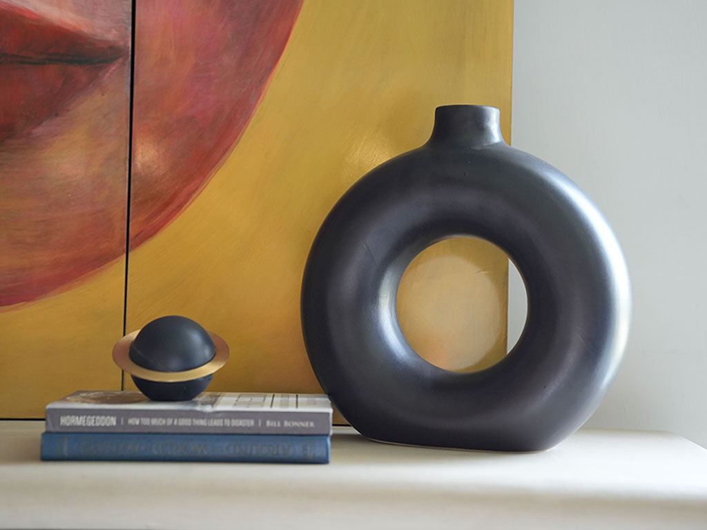 Introducing our Black Donut Vase, a sleek and modern addition to your home decor. This unique vase features a donut-shaped design in a bold black color, adding a touch of contemporary flair to any space. Perfect for displaying flowers or as a standalone decorative piece, this vase is sure to make a statement in your home.