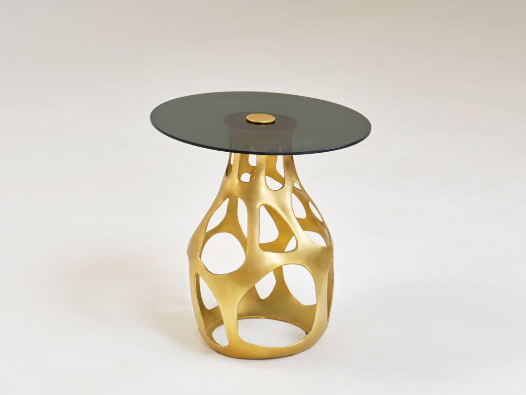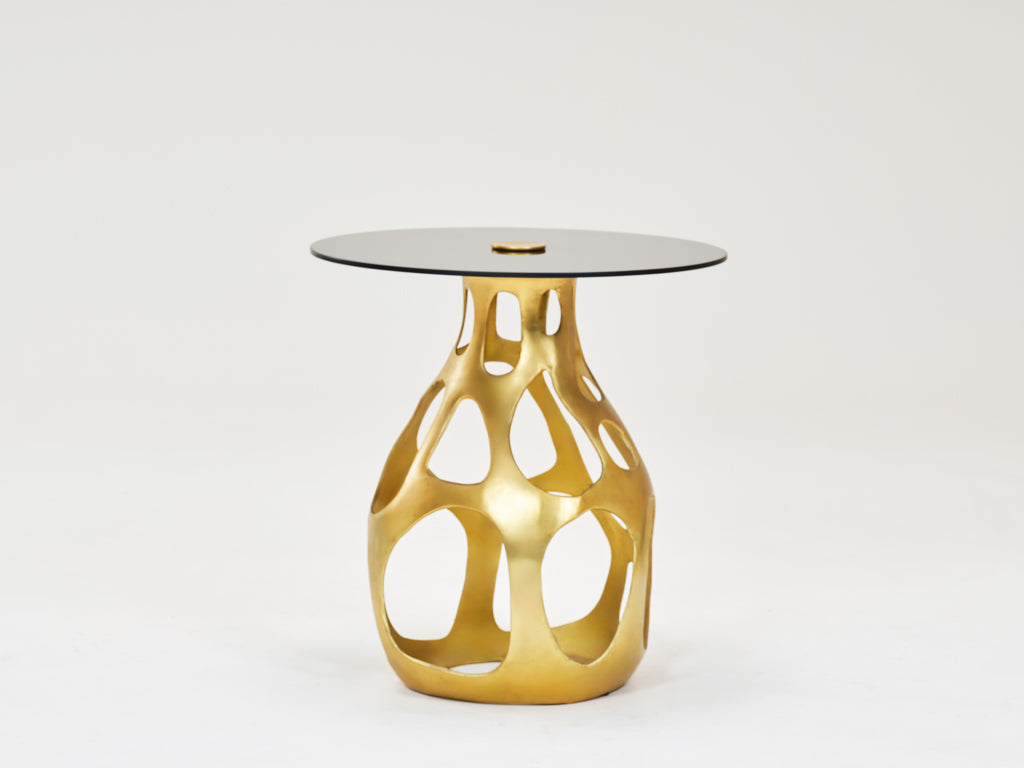 The Volcano side table is a striking piece, combining modern aesthetics with a playful design. Its metal frame, reminiscent of cheese holes, adds an artistic and contemporary touch. The colored glass top in dark grey brings a sense of transparency and airiness to the space, while maintaining a sleek and sophisticated appearance. Crafted from premium-quality materials, this table exudes the flair of high-end designer furniture, making it a bold yet elegant addition to any room.