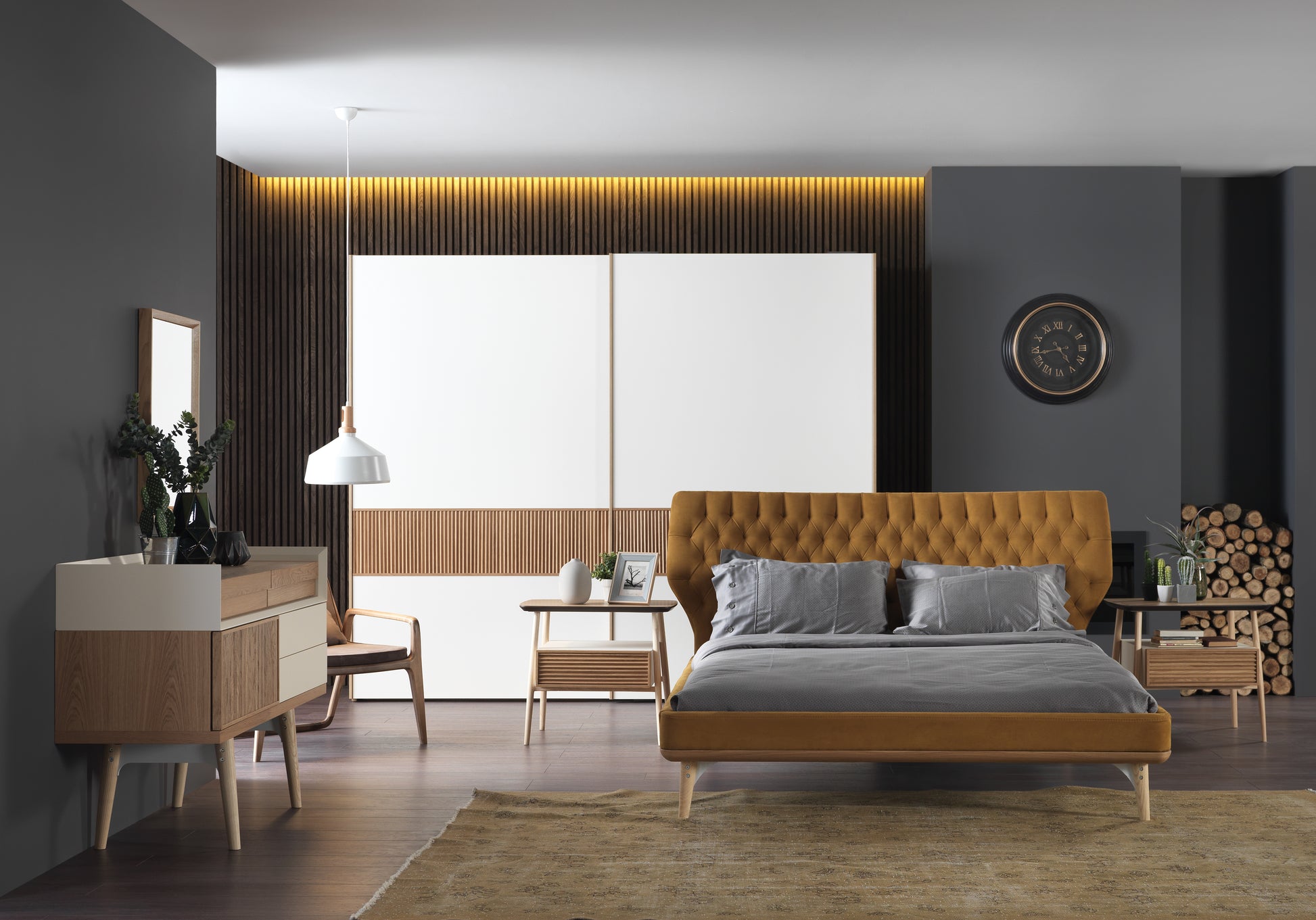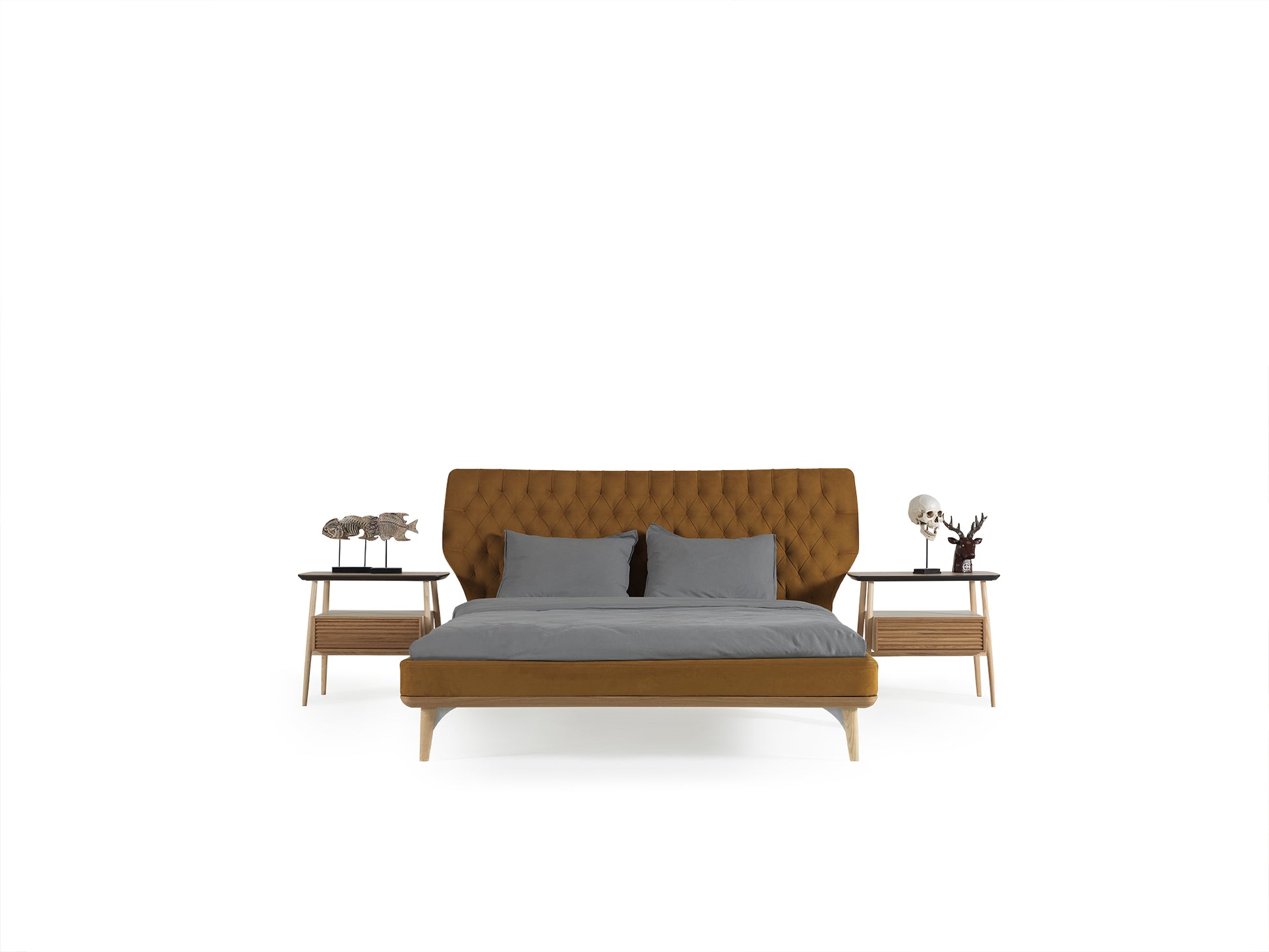 The Natura Bed combines comfort and sophistication with its plush upholstered headboard and elegant tufted detailing. Supported by sleek wooden legs, it balances modern design with timeless appeal. Its inviting structure and earthy tones create a serene atmosphere, making it the perfect centerpiece for a restful bedroom that embodies both style and natural warmth.