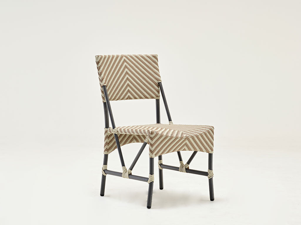 Inspired by zebra textures, this dining set merges elite design with comfort and durability. Synthetic rattan, woven on an aluminum frame, offers both sturdiness and visual appeal. The set includes four chairs and a round dining table with a glass top and lower shelf for added storage.