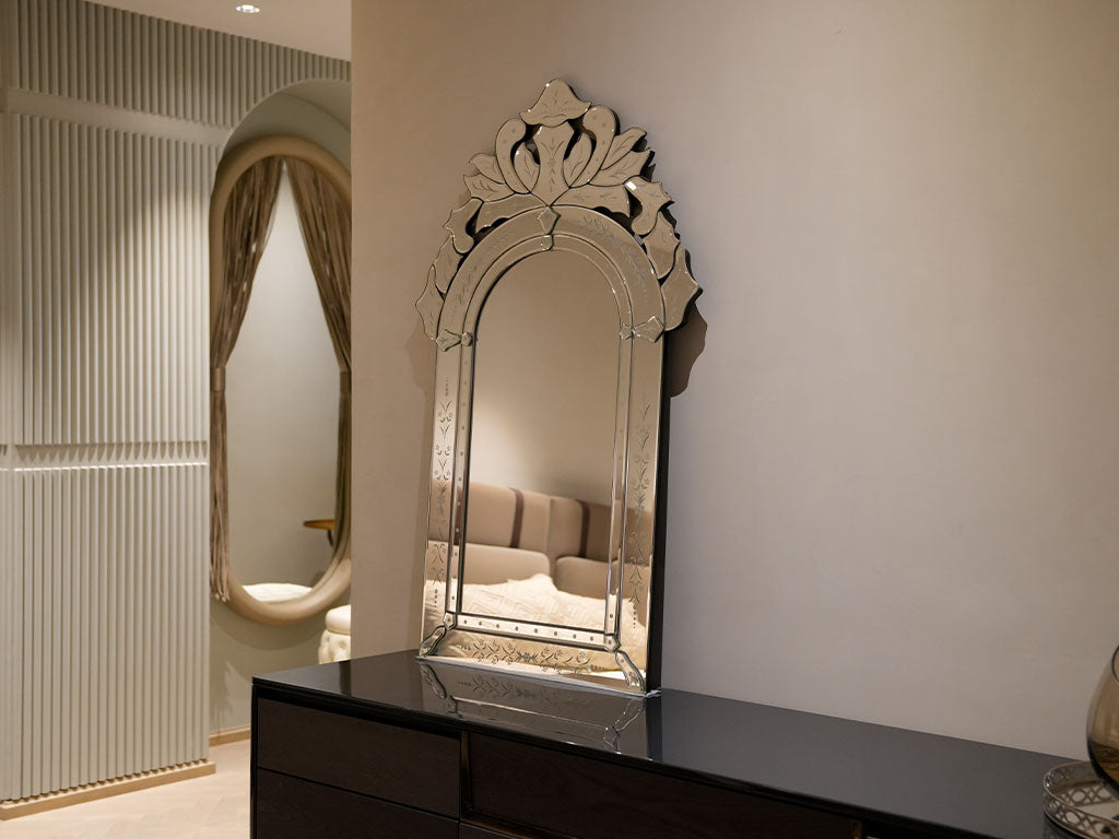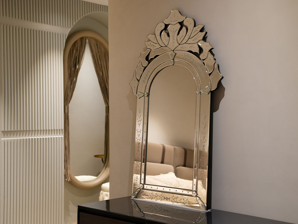 This ornate mirror features a beautifully detailed frame with elegant floral and scrollwork patterns, exuding classic charm. Its arched design adds a touch of sophistication, making it a perfect accent piece for any traditional or modern space.