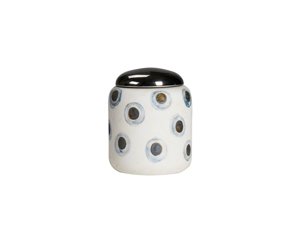 A ceramic jar featuring a pristine white body adorned with blue circle designs, complemented by a sleek metal cap. An exquisite blend of elegance and functionality for any setting.