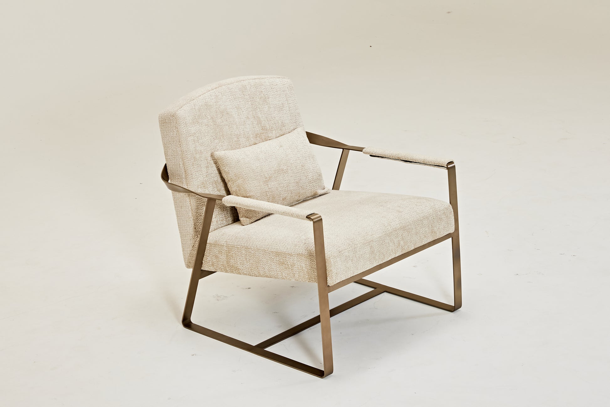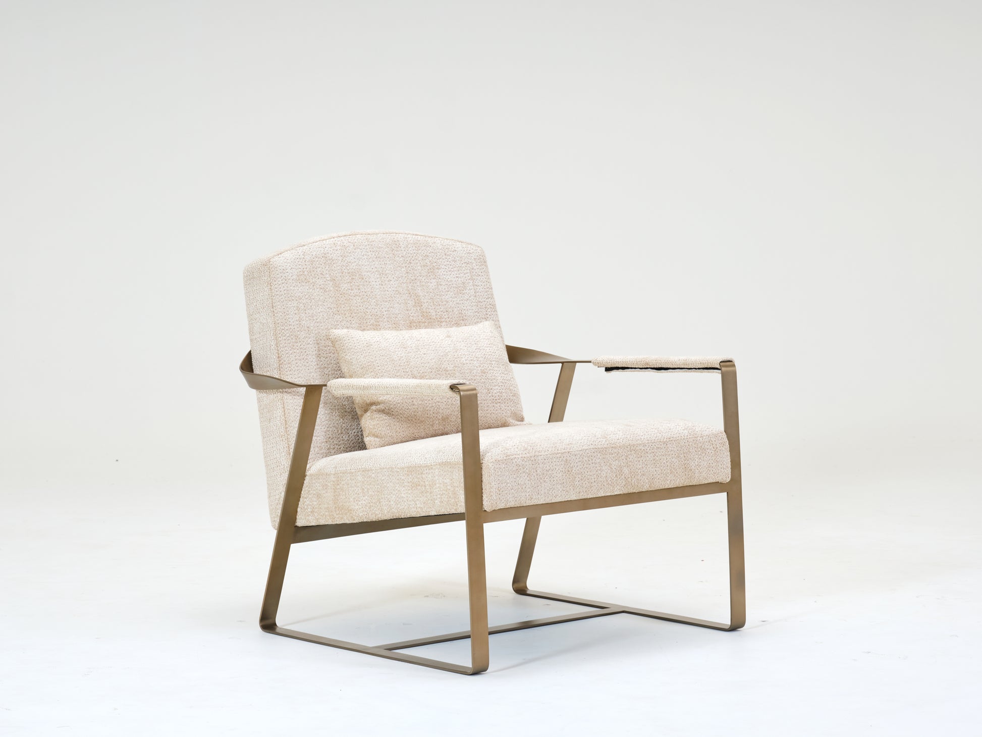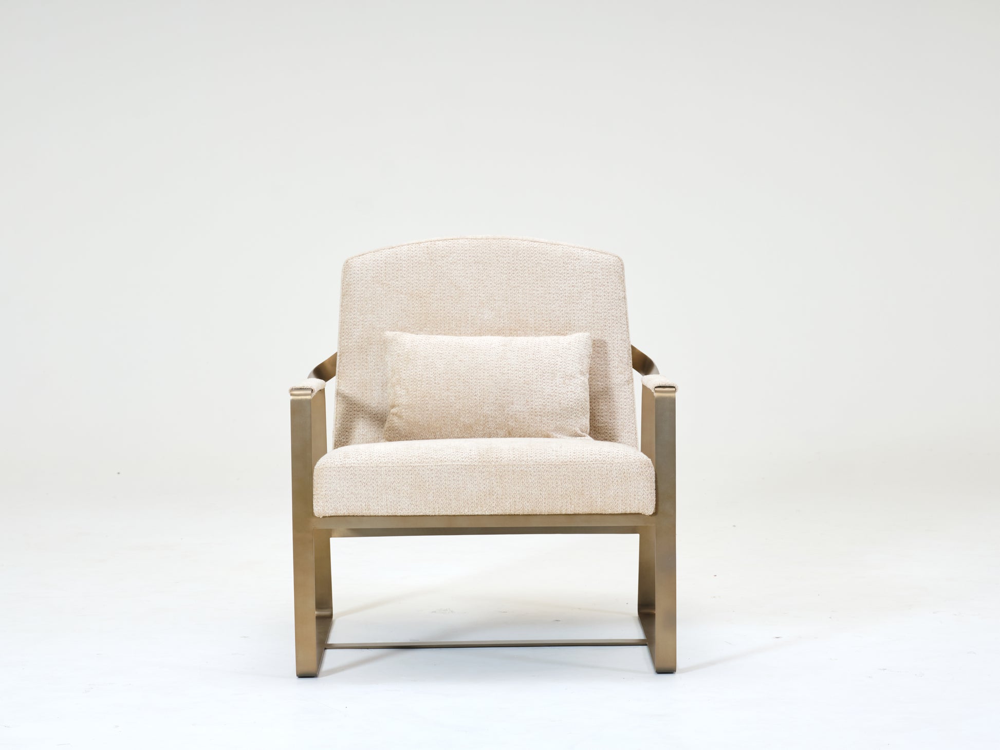 The Sophia Arm Chair is where sophistication meets modern comfort. With its sleek, geometric metal frame and soft upholstered cushioning, it brings a perfect balance of style and support. The addition of a plush lumbar pillow enhances relaxation, making it ideal for both lounging and formal seating areas.