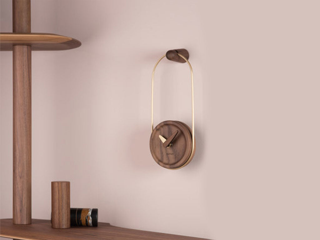 Introducing the Mini Pendulum by Nomon: Inspired by jewelry, featuring a 10 cm diameter and 26.5 cm length. Available in graphite or polished brass with walnut accents. Crafted with a polished brass ring, walnut box, and hands.