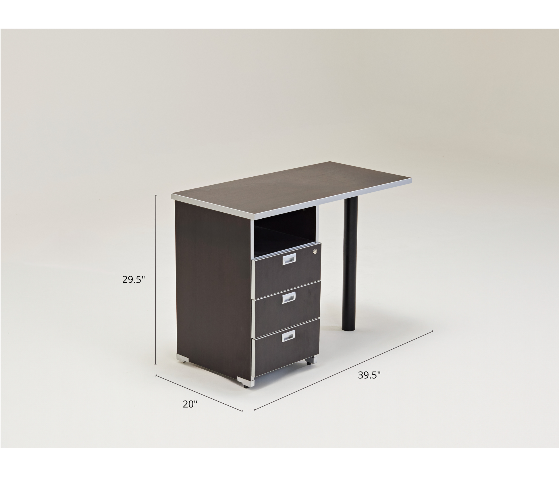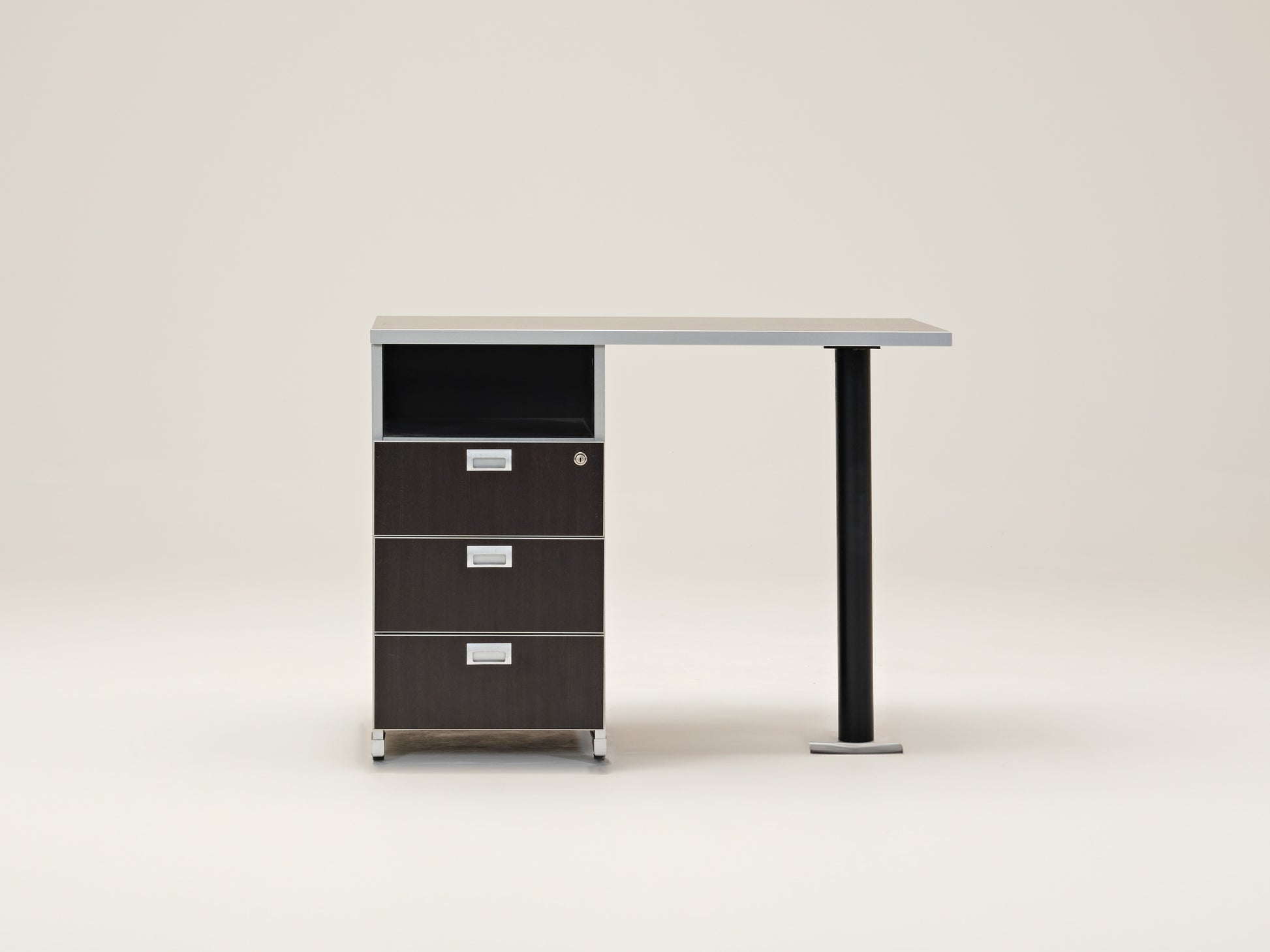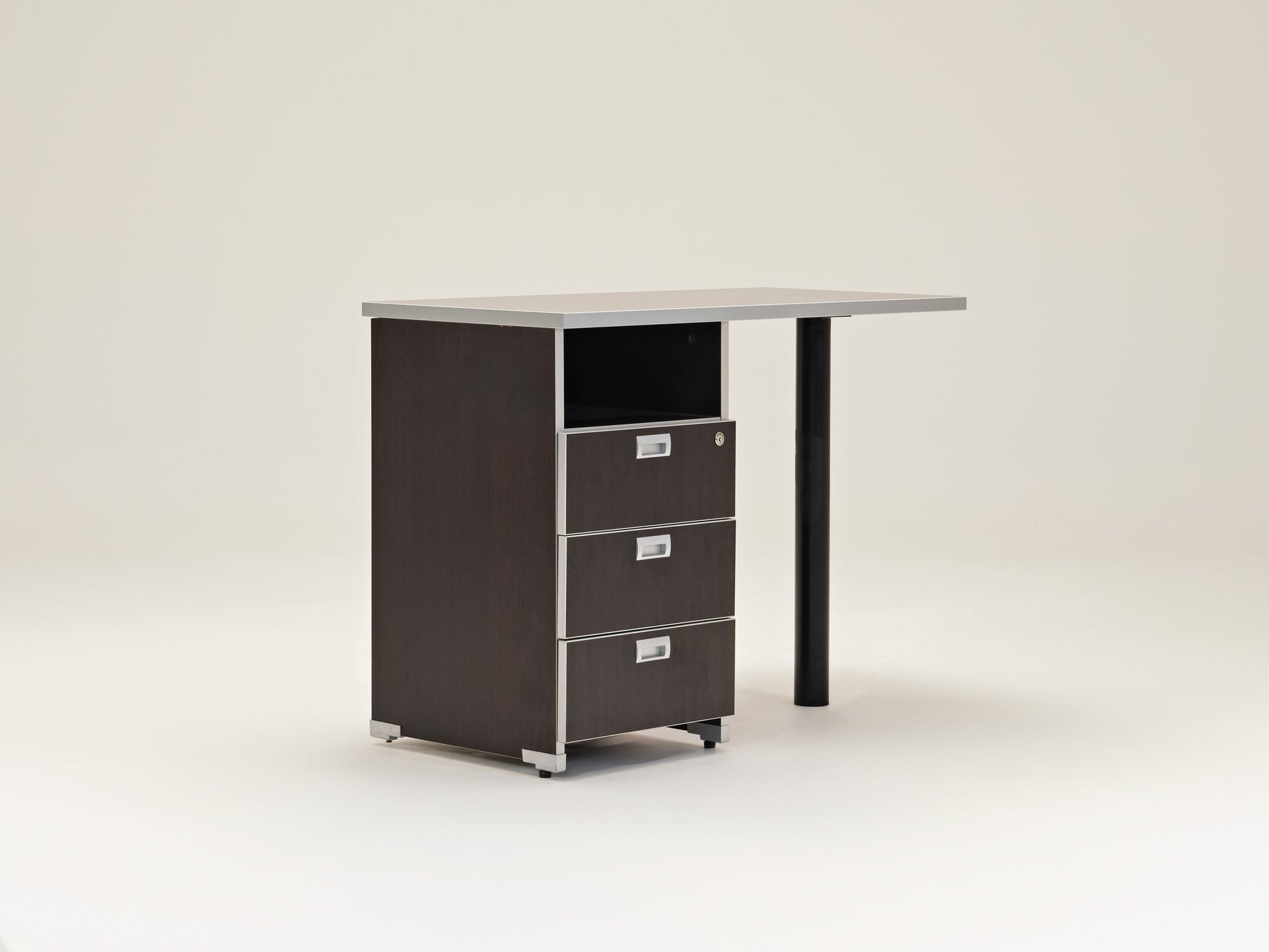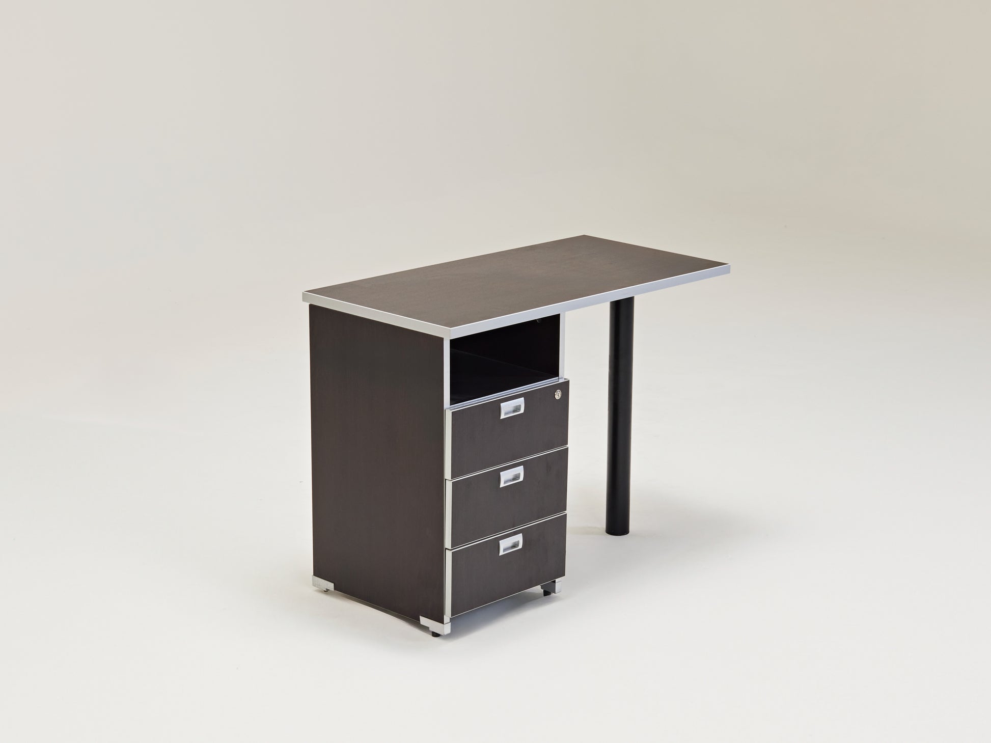 A sleek and modern desk featuring a spacious work surface supported by a sturdy metal leg. It comes with a built-in pedestal, offering three lockable drawers for secure storage. Ideal for home or office use, it combines functionality with a contemporary design.