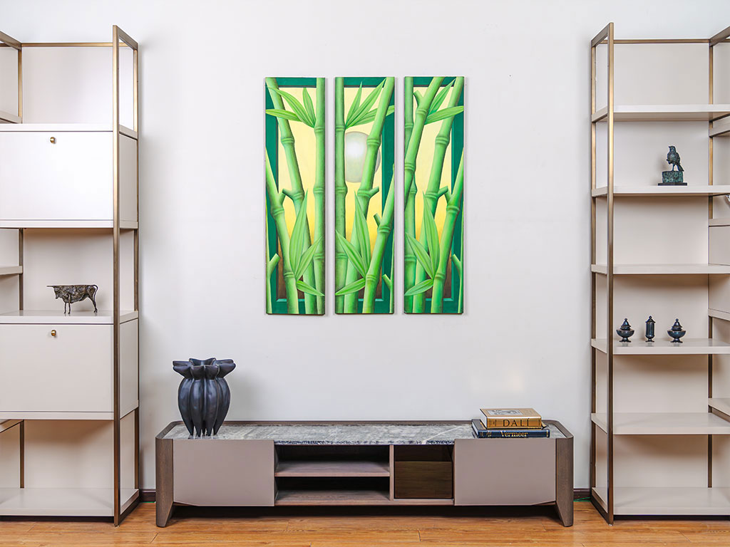 Three vertical panels are adorned with striking bamboo paintings. The slender stalks rise with quiet strength, their textured nodes and graceful leaves meticulously depicted. Against a backdrop that shifts from serene greens to subtle earth tones, the bamboo's presence is a testament to resilience and harmony. This triptych captures the essence of nature's balance, offering a serene and contemplative experience that transcends the boundaries of the canvas.
