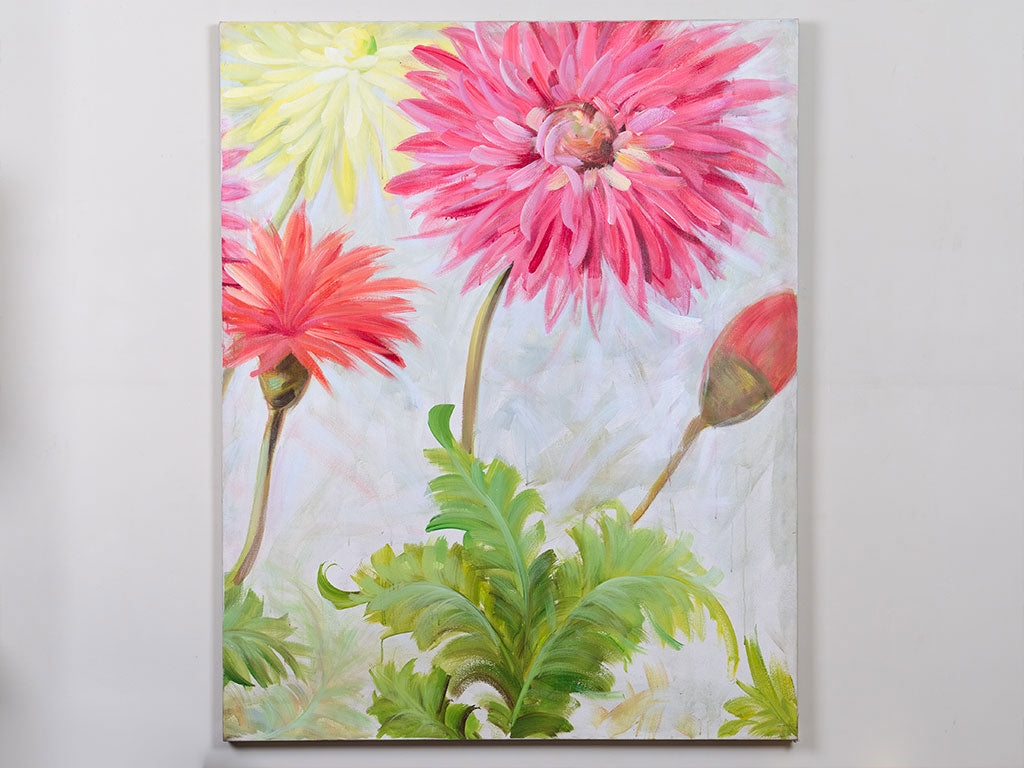 On the canvas, a captivating pink flower takes center stage. Delicate petals unfurl with grace, their shades ranging from soft blush to deep rose. The intricate detailing of each petal and the flower's core draws the viewer into its intricate world. This painting embodies the gentle elegance of nature, reminding us of the delicate yet enchanting beauty that blossoms around us.