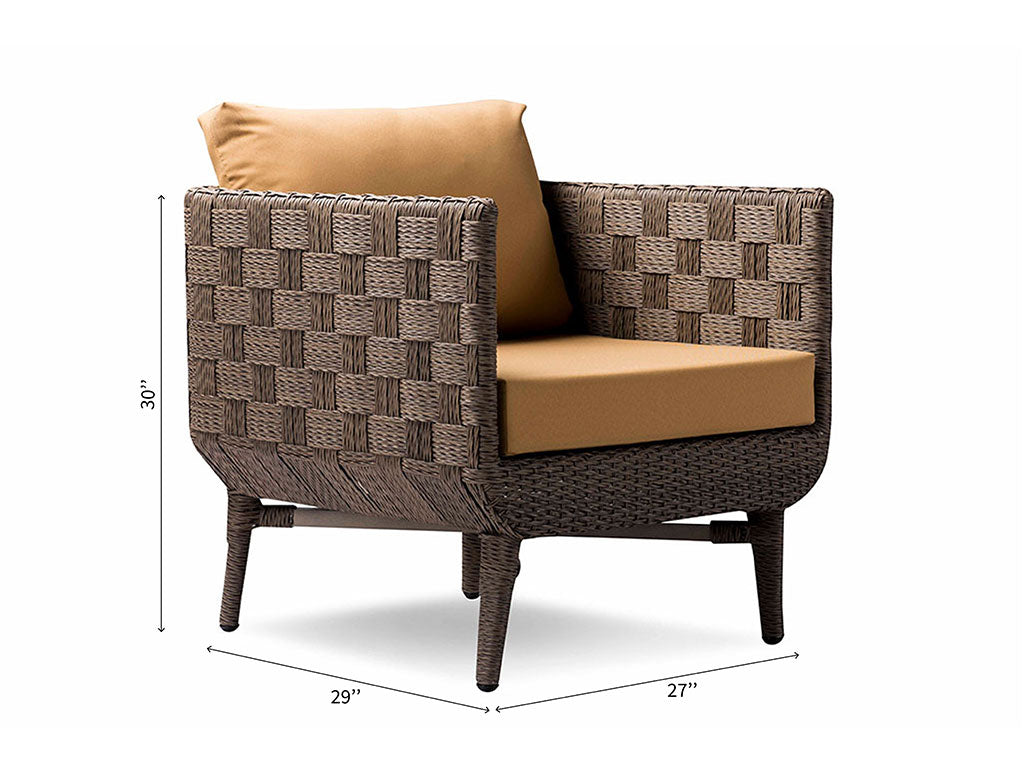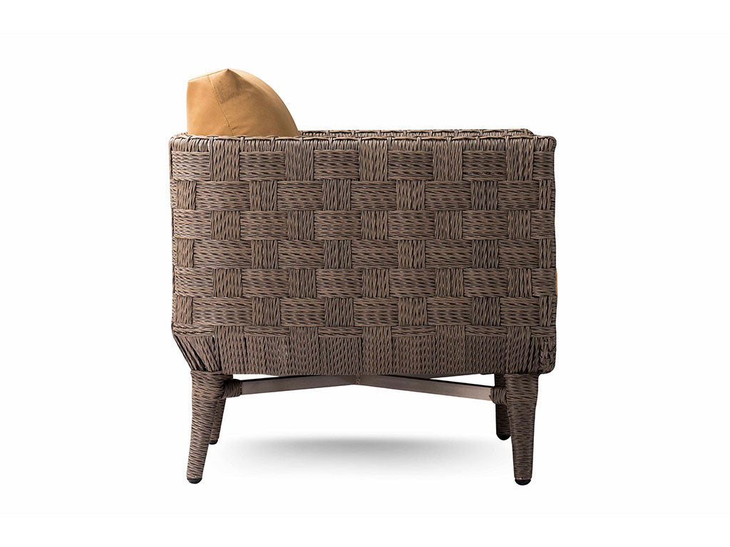 Unearth the wealth of serenity of nature outdoors, with York Chair. Envisioned to provide you uninterrupted experience of outdoor fun, it is made from synthetic Rehau wicker and woven in a beautiful parquet pattern. Upholstered in all-weather imported outdoor fabric and aluminum base, the wide seating and cushioned back nods to a stylish & comfortable poolside or garden lounging.